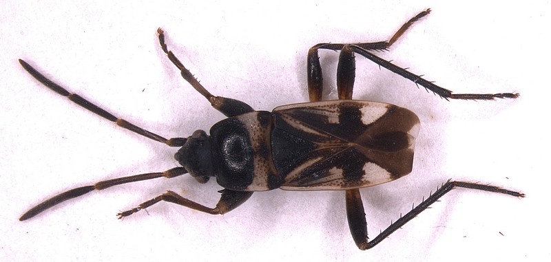 Rhyparochromus (Raglius) alboacuminatus (Goeze, 1778), specie piuttosto variabile nella colorazione. L'esemplare presenta un interessante caso - non infrequente nei Lygaeidae - di oligomeria antennale sul lato sinistro. |