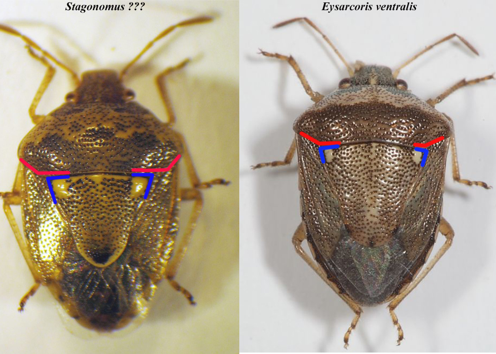 Altro carattere "empirico": la parte apicale dell scutello in Stagonomus è a punta, in Eysarcoris è arrotondata. Anche la lunghezza dello scutello è diversa.