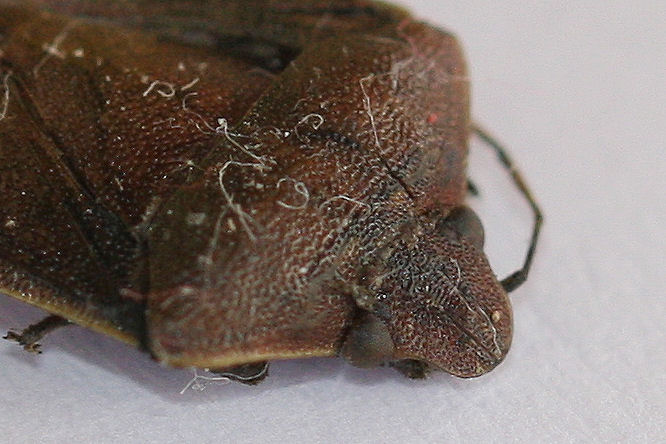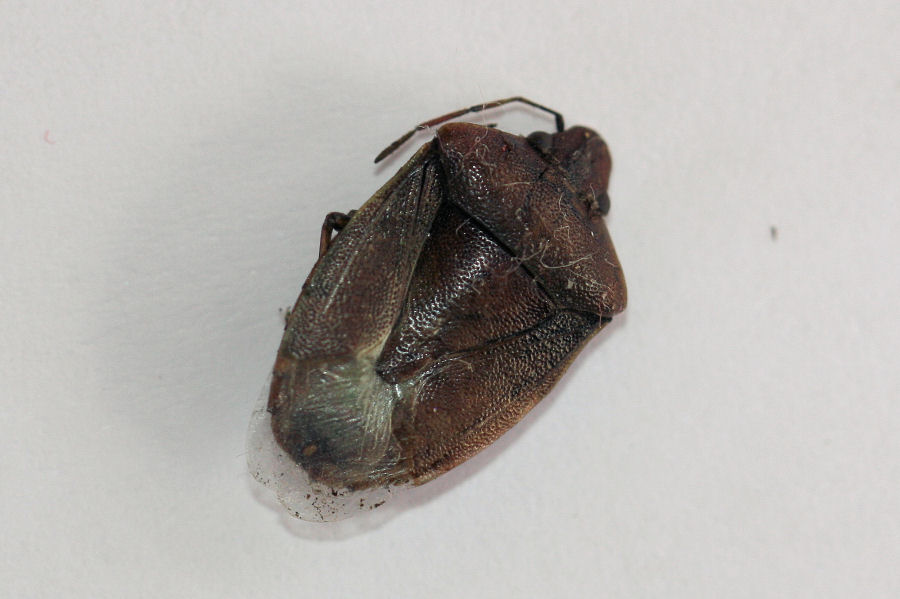Ho trovato questo Pentatomide morto sotto la corteccia parzialmente sollevata di un ippocastano. Non riesco a capire che cosa possa essere (mi ricorda un po' Peribalus sp. - ma non credo sia lui). Mi hanno colpito le membrane più lunghe del corpo e la testa relativamente larga, inoltre appare molto piatto. Misura 12-13 mm di lunghezza e 7mm di larghezza (parte più larga del pronoto).