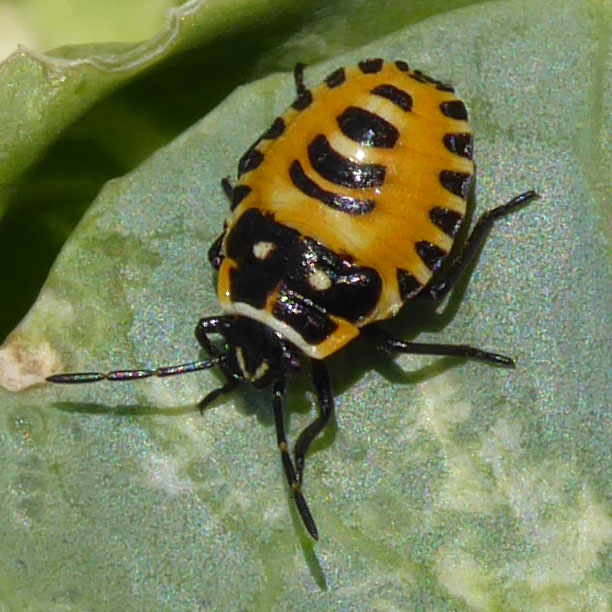 Buongiorno! Sabato ho fotografato diversi esemplari di questi insetti a zonzo sui cavoli cappuccio nell'orto; a parte poter dire con un certo grado di sicurezza che sono emitteri pentatomidi, non so cosa siano. Ho fotografato sia adulti, sia (quelli che io presumo siano) stadi immaturi. Qualcuno sa di cosa si tratta?