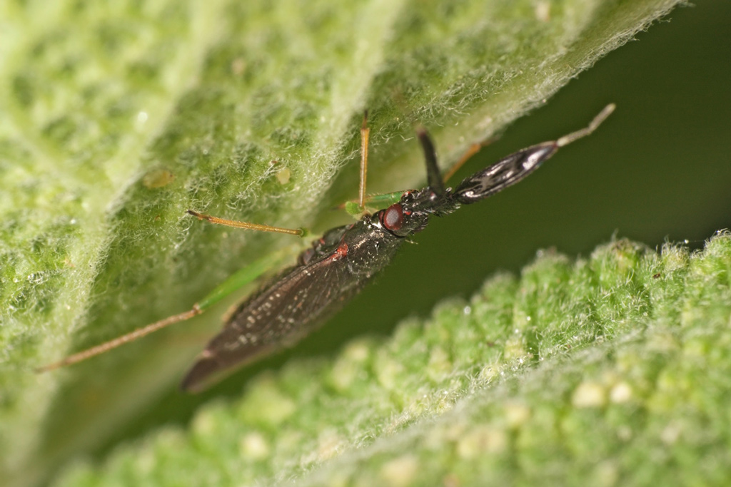 The broad and flattened 2nd antennal segment, dark ground colour and contrasting greenish legs make this species unmistakeable.