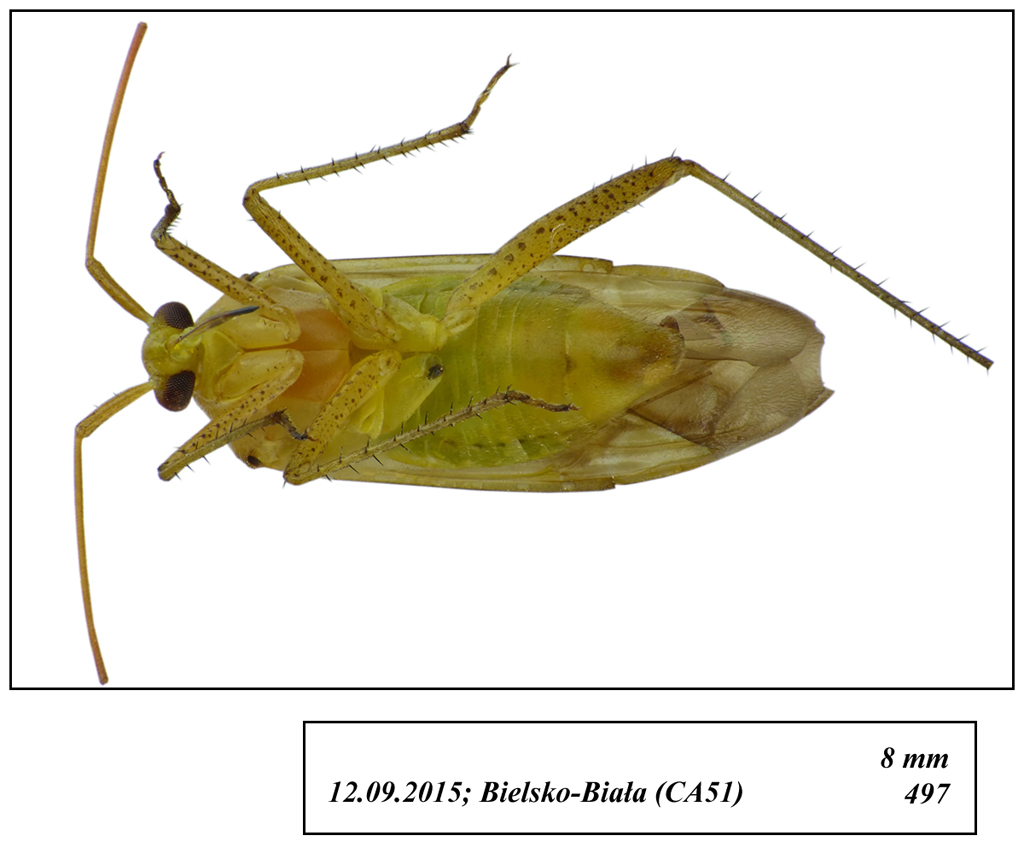 Thanks for answer ![]() I have one more question. Wagner (in his key to Miridae) wrote about black hair on dorsal side of hemelytra: 1 (12) Dorsal side covered by short, pale setae, without black hair --> 2 Here is the part of key with every species without QUADRIPUNCTATUS And the last point: 12 (1) Dorsal side with small, black haire, mixed with pale and shining hairs. --> Quadripunctatus I cannot see black hair in my photo, therefore I exclude A. quadripunctatus. What do you think about this ? Best regards Grzegorz |