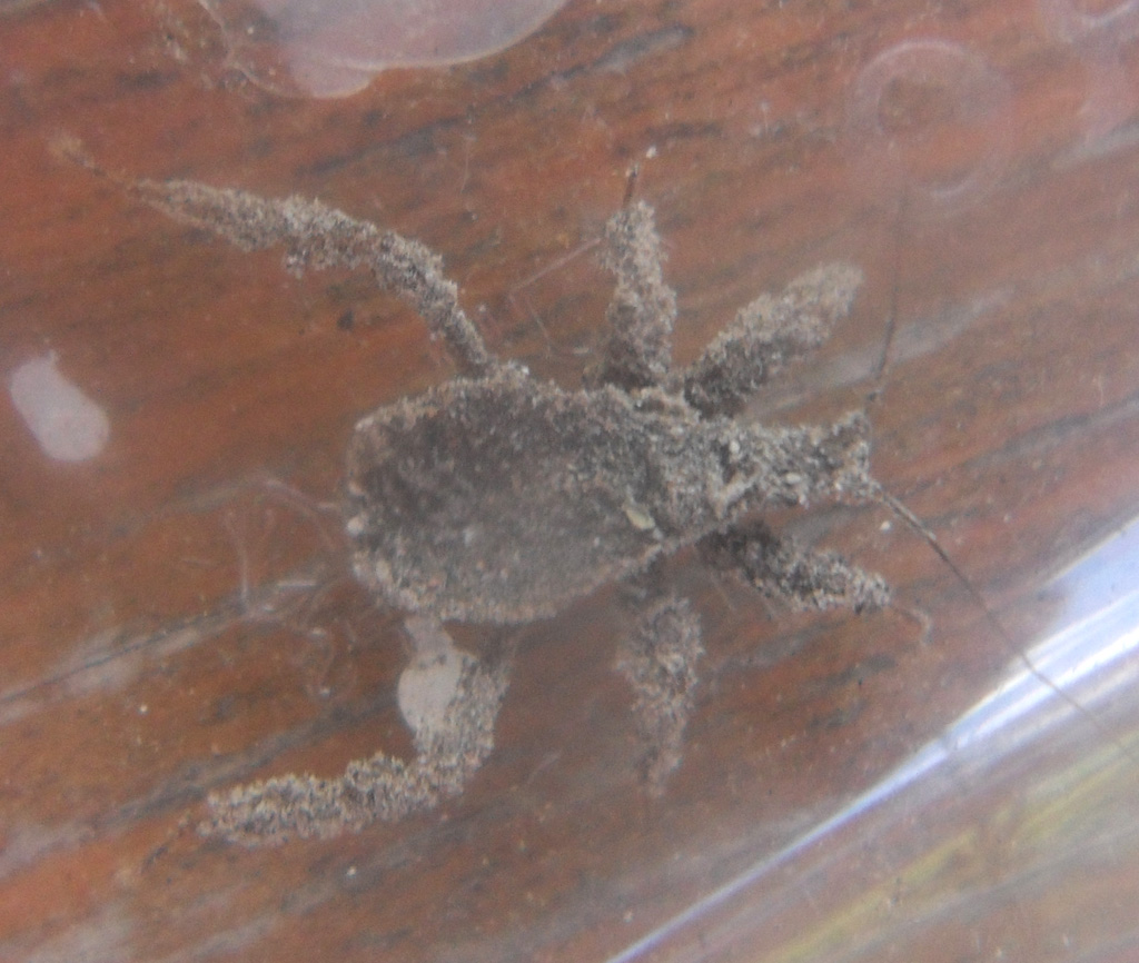 Questa neanide di Reduvius personatus l'ho trovata sotto un mattincino di legno in un angolo della mia veranda. L'ho allevata per due settimane, però poi per mancanza di prede l'ho dovuta liberare.