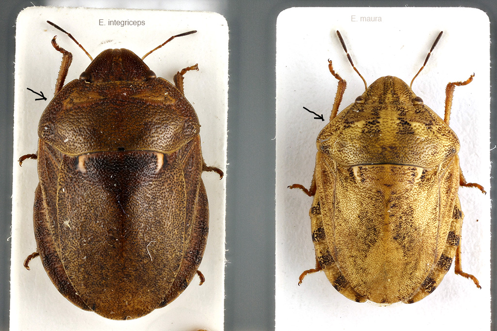 The most reliable character to separate the two species are male genitalia: the phallus of E. integriceps is provided with one pair of sclerotized processes, that of E. maura with two pairs. In addition the anterior lateral margin of pronotum is straight in E. maura, distinctly curved, bowlike in E. integriceps (it seems straight in your photos, but I know that photos may be misleading). Besides, the body of E. integriceps is generally elongate, that of E. maura shorter.