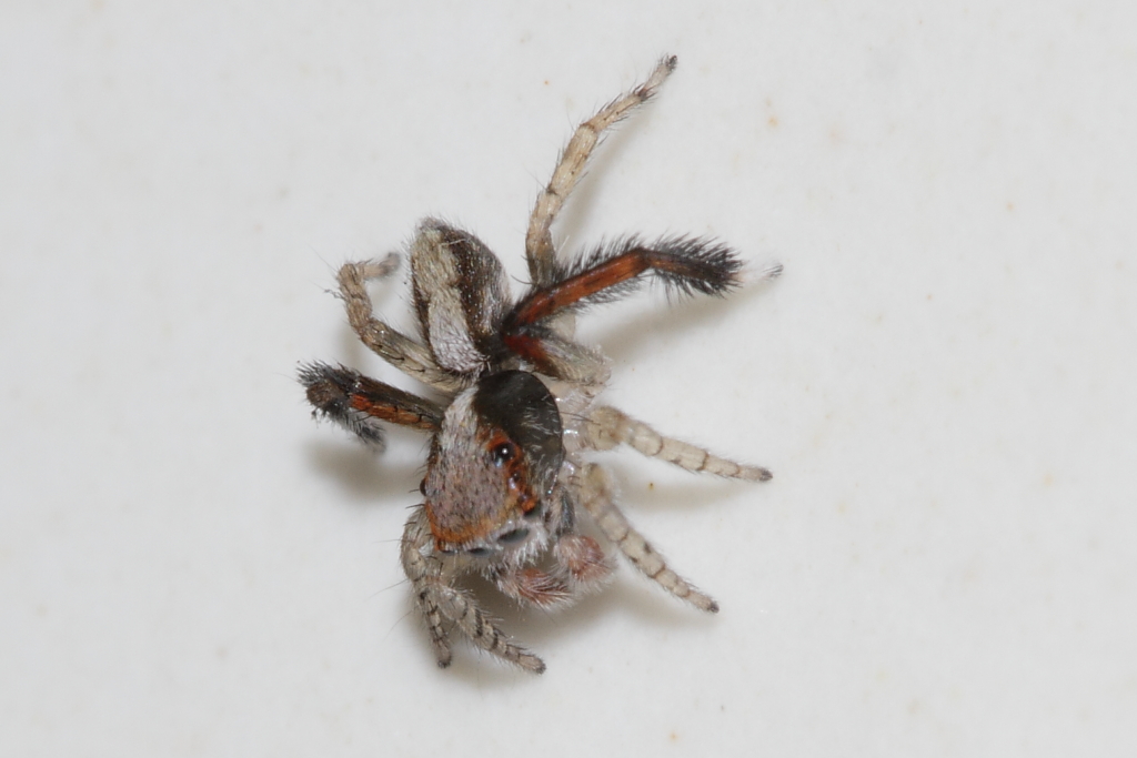Salticidae molto caratteristico. Maschio di Saitis barbipes (Simon, 1868). Unico dubbio che ho riguarda l'altra specie italiana, S.imitata, della quale non ho mai visto foto. Il maschio dovrebbe presentare il folium addominale puntinato, invece della banda longitudinale come nel caso qui riportato.