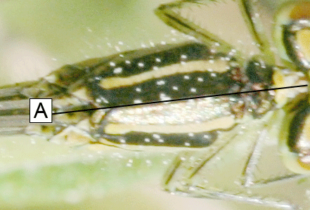 Io credo che Maurizio si sia fatto ingannare dalla colorazione non omogenea della parte superiore del torace (nell'ingrandimento si vede bene una parte scura e l'altra con il riflesso). Se consideriamo precisamente la linea mediana che divide il torace a metà longitudinalmente e la prolunghiamo sul pronoto (A) io più che incisione su quest'ultimo ci vedo una protuberanza e quindi, secondo me, con ogni probabilità si tratta di una femmina di Coenagrion scitulum (Rambur, 1842)