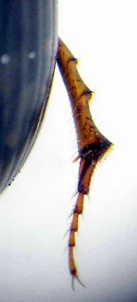 Primer tarsomero pata posterior un poco mas corto que la espina apical superior.