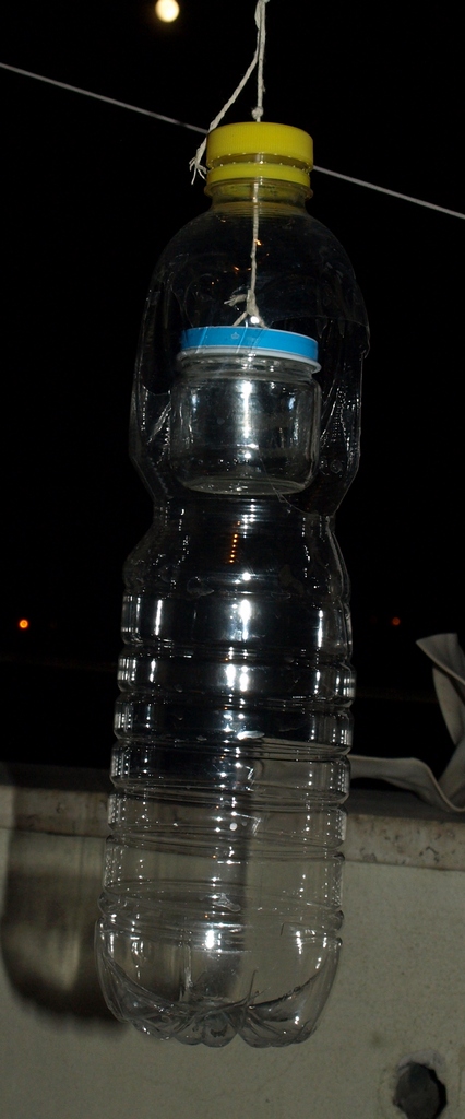 Oltre che macabre, sono sicuramente funzionali, ma il problema è che trovi tutti gli insetti impiastrati (e i primi caduti finisco distrutti dai successivi). Per evitare questo io uso una versione "pulita" della bottiglia appesa. In pratica, dopo aver fatto due buchi sul lato, abbastanza in alto, appendo all'interno un barattolino vuoto di omogeneizzato col tappo sforacchiato. Dentro il barattolino ci metto l'esca (carne, pesce. gorgonzola, bigattini, ecc., secondo cosa voglio attirare). Nella bottiglia ci metto circa 1/2 litro d'acqua e sale col solito sapone, e qualche giorno dopo me li ritrovo tutti nell'acqua interi e puliti. La foto non è molto chiara ma l'ho fatta adesso, al buio.