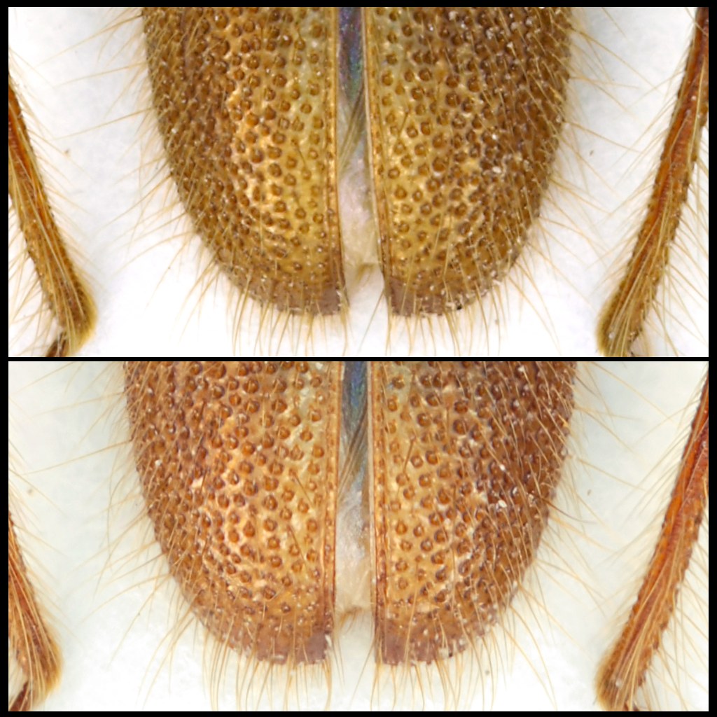 E questo è un crop della parte posteriore delle elitre, sopra Olympus, sotto Nikon: