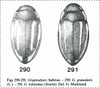 Ciao Loris Il genere cui appartiene il piccolo ditiscide da te fotografato è Graptodytes (Dytiscidae, Hydroporinae). Malgrado la livrea particolare, questa da sola non può bastare per discriminarlo a livello specifico. Le possibili identità sono due e cioè: Graptodytes granularis o G. bilineatus. Ti mostro un disegno che raffigura le due specie, tratto da "The Aquatic Adephaga (Coleoptera) of Fennoscandia and Denmark: Dytiscidae. Autori: Anders N. Nilsson, Mogens Holmen (1995)": Osservando allo stereomicroscopio l'esemplare si può comunque agevolmente determinarlo. Ecco intanto due facili caratteri che puoi controllare (se servissero, ce ne sono degli altri): Forma corta e convessa. Rapporto lunghezza/larghezza = 1,9. Lunghezza 2,1-2,4 mm. Articoli mediani delle antenne (dal 5° al 9°), circa una volta e un quarto più lunghi che larghi............ G. granularis (Linnaeus, 1767) Forma più slanciata. Rapporto lunghezza/larghezza = 2,1. Lunghezza 2,4-2,7 mm. Articoli mediani delle antenne (dal 5° al 9°), circa una volta e tre quarti più lunghi che larghi......... G. bilineatus (Sturm, 1835) Personalmente già un'idea, osservando l'immagine, me la sono fatta, ma non voglio condizionarti P.S. - Auguri per oggi