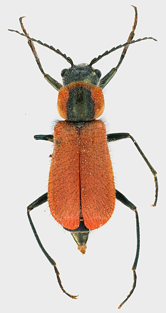 Questo Malachiidae, uno dei più belli della famiglia, almeno tra quelli che trovo io, mi lascia dubbioso. Per la colorazione pensavo fosse questo, ma poi ho notato che sia quello di Loris, sia le foto sul Web, mostrano una bestia glabra oi quasi, mentre il mio, di cui ogni tanto trovo un esemplare, quasi sempre intorno a casa, è molto peloso. Inoltre le dimensioni dell'Anthocomus coccineus (o Malachius coccineus, ancora non l'ho capito) sono di 4-5 mm, mentre il mio è molto più grande (8 mm). Altra specie, o addirittura genere, o magari questa è una femmina e le differenze di dimensioni e peluria sono caratteri sessuali?