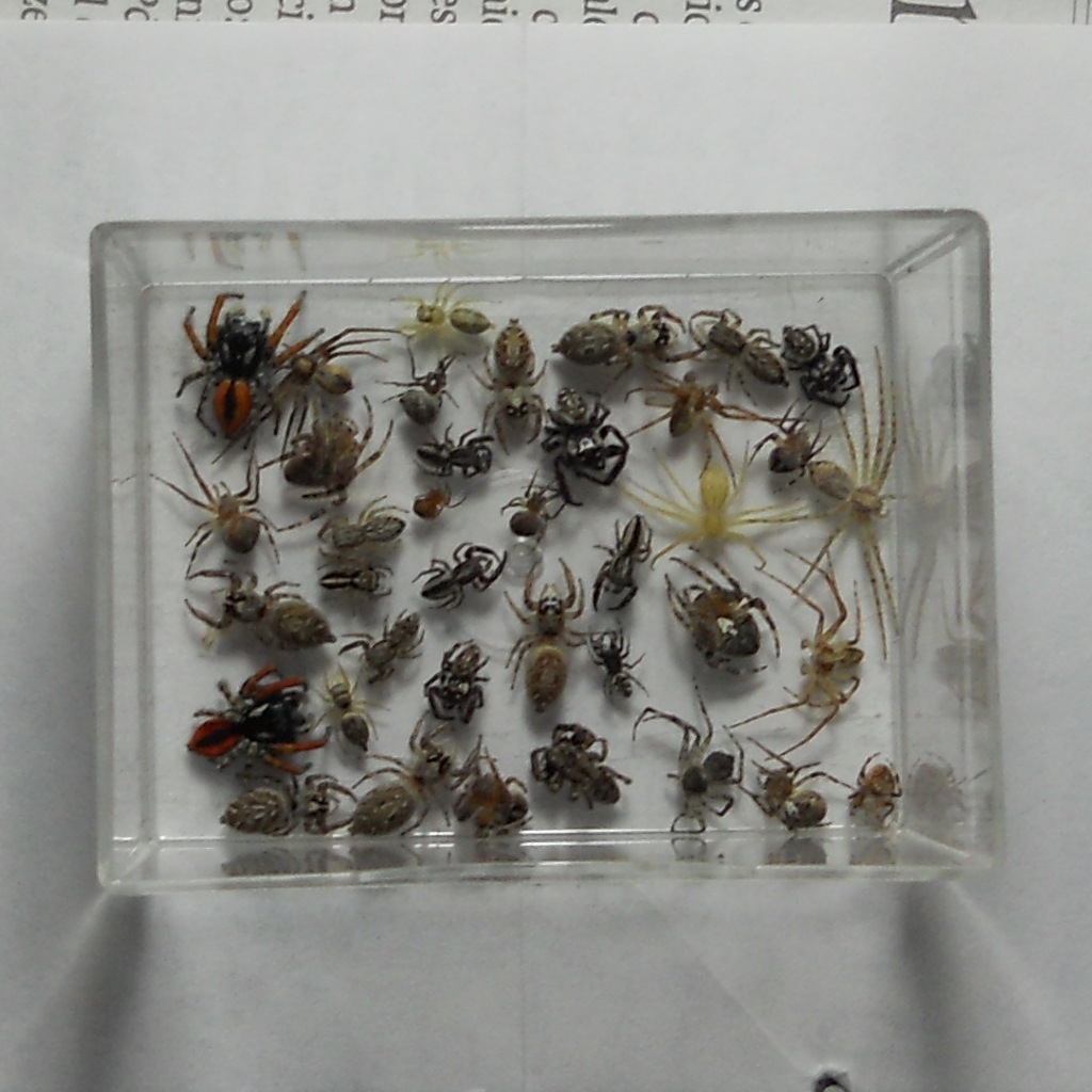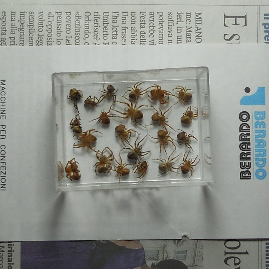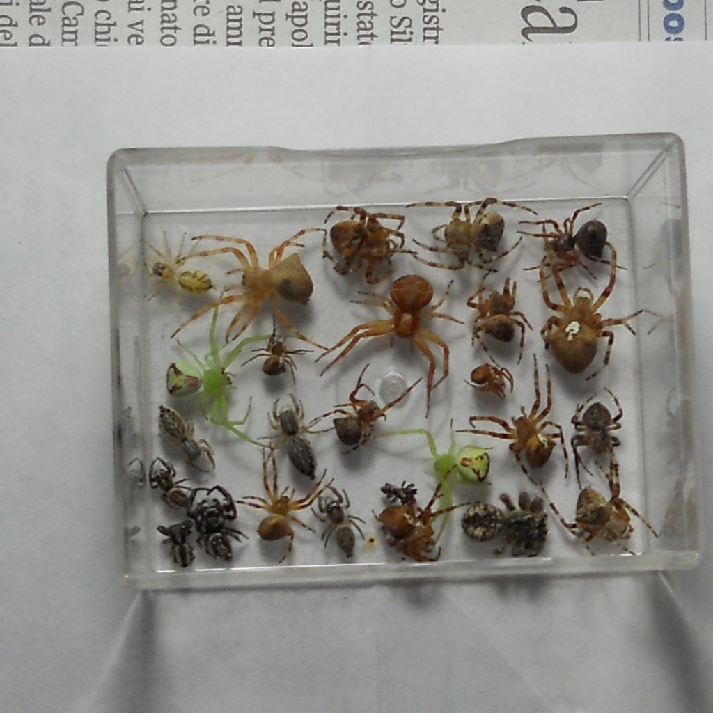 Qualche giorno fa, mi sono imbattuto in alcuni nidi di vespa vasaio che aveva costruito in alcuni scatoloni. Dopo averla cacciata via, ho recuperato i nidi, riuscendo a prelevare un gran numero di ragni, credo paralizzati e quindi ormai morti. Siccome ce ne sono di interessanti e svariati specie, volevo chidervi se riuscivate a riconoscerne qualcuno!