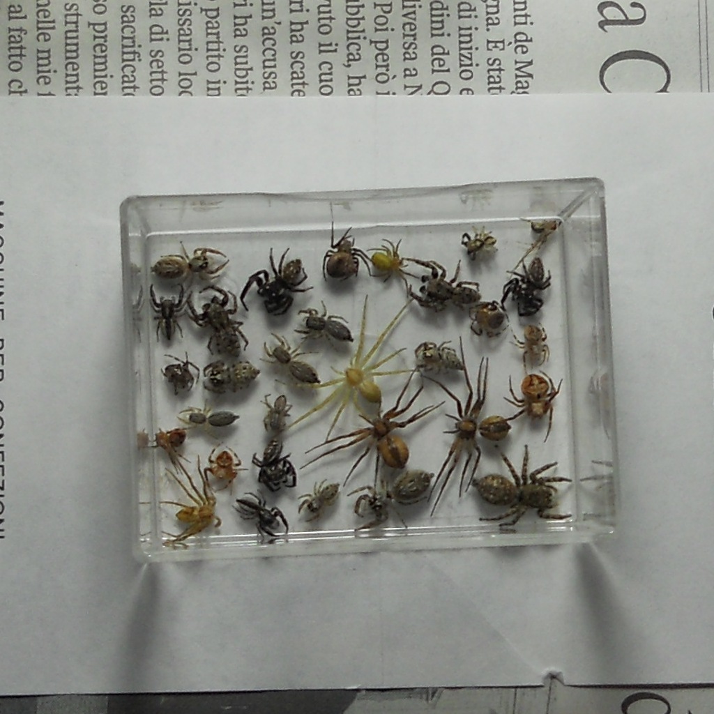Pactolinus ha scritto: Umbro ha scritto: - Provette con tappo a vite. - Alcol per liquori 95° miscelato con H2O distillata per portarlo a 75° (77,3% alcol - 22,7 H2O) - Invio in busta imbottita.  Grazie mille!! oggi prendo le provette e mi metto subitissimo al lavoro..!! elleelle ha scritto: Certo, hai fatto una bella demolizione! A occhio e croce saranno stati almeno una decina di "loculi". Se guardi bene, forse trovi anche le uova o le larvette dello Sceliphron sp. appiccicate a qualche ragno. Quanche domanda: li hai trovati nelle cellette in ordine sparso, oppure di solito una celletta era piena di ragni della stessa famiglia? Il nido era unico, oppure ce n'erano due (ognuno costituito da un certo numero di loculi)? Mi sembra di intravedere due distinti stili di caccia .... La maggior parte mi sembrano abbastanza leggibili fino al genere; mi incuriosisce il Thomisidae chiaro, che non riesco a inquadrare (forse, Diaea dorsata?, ma il colore è insolito)...... Aspettiamo l'esito dell'inventario. Con tutti questi oggetti, Carlo dovrà abbassare la saracinesca per qualche giorno per farlo, come fanno i commercianti a fine anno .....  luigi Allora..i ragni povengono da due vespe diverse, quindi da due nidi diversi..ogni vespa aveva costruito più di una cella..una, aveva tipo 6 celle o più, non collegate tra loro, proprio staccate una dall'altra e le avevano fatte attaccate ad uno scatolone contenente dei libri..l'altra aveva fatto il nido su un angolo abbastanza alto della casa, e il nido era a forma di "pugno", quindi non a singole celle..in pratica dopo una cella, gliene costruisce una sopra all'altra, e così via..i ragni erano in ordine casuale, però i più grossi che vedi erano nel nido a "pugno"...ho notato ad esempio, che solo in quest'ultimo c'erano i ragni verdi dell'ultima foto, che ho notato essere Misumenops tricuspidatus femmina..invece solo in quell'altro, i ragni arancioni, che ho scoperto essere i maschi di Philaeus chrysops..si si ho trovato anche qualche larva, alcune minuscole, altre già grosse come una tarma..e pensare che alcuni li ho anche lasciati..  (non sono sicuro delle specie che ho detto! era solo a occhio!)