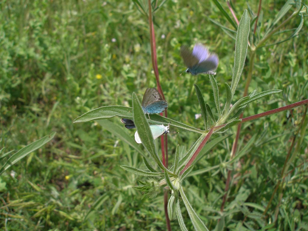 Stavo cercando di fotografare in posizione consona l’accoppiamento di questi Licenidi, quando altri due individui (maschi suppongo) hanno cominciato a disturbare la coppia incuranti della mia presenza e dei miei tentativi di allontanarli e di spostare lo stelo in modo da avere la visuale libera. I tentativi dei due importuni sono continuati per lungo tempo, finché, dopo aver potuto fare una foto ragionevole, non me ne sono andato.