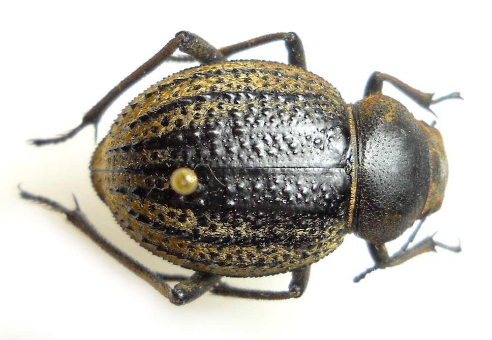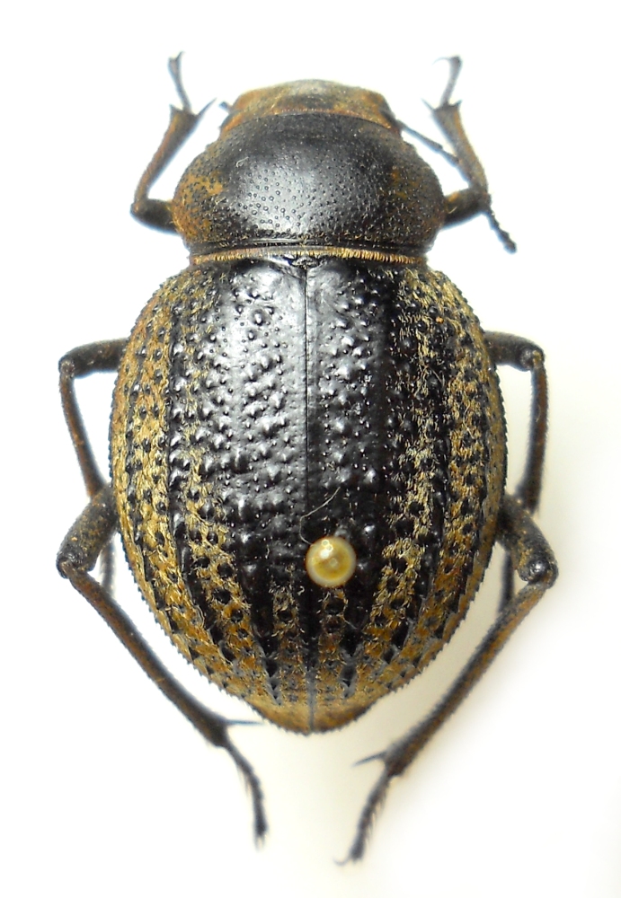 Questo, come la maggior parte degli esemplari che inserirò, l'ho preparato io ;) . Il posizionamento così arretrato dello spillo è il mio modo di preparare i Tenebrionidi (spillo le specie di dimensioni medio grandi, come Pimelia, Blaps, ecc.; nello studio di questi generi è spesso molto importante studiare alcuni caratteri del lato ventrale): questi Tenebrionidi atteri hanno il metatorace molto breve e, di conseguenza, il secondo e terzo paio di zampe molto ravvicinati; inserendo lo spillo più in alto è facile offendere le coxe con conseguente impossibilità di posizionare le zampe in modo simmetrico.