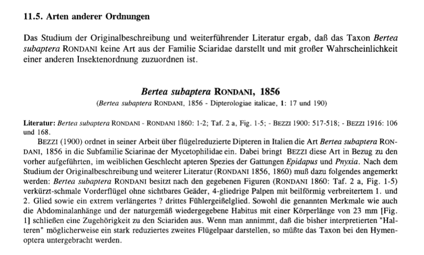 Ve ne riassumo il contenuto, riportando i disegni originali del Rondani, sui quali essenzialmente si è basato Menzel per avanzare l'ipotesi che il taxon descritto da Rondani non solo non sia uno Sciaridae, ma non appartenga nemmeno all'ordine dei ditteri e "...con grande probabilità, sia il rappresentante di un altro ordine d'insetti."