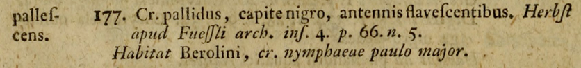 Venne poi descritta anche come Criceris pallida da Herbst nel 1783 a pagina 66 del suo" Kritisches Verzeichniss meiner Insektensammlung. In: Foessli J. C. Arch. f. Insectengesch., Zürich, 4: 1-72." che però non sono riuscito a trovare :cry: :cry: