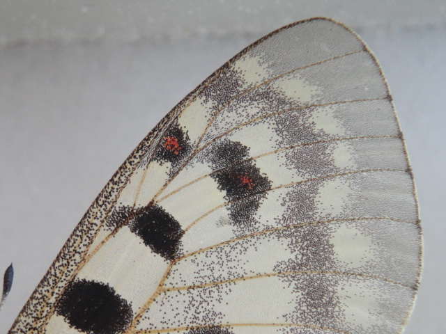 Parnassius phoebus, antenne grigio-bianche anellate di nero e macchia rossa nello spazio S8 dell'ala superiore
