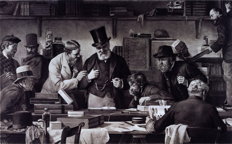 E. Armitage dipinge questa scena in cui rappresenta se stesso felice mentre mostra orgoglioso un raro esemplare da aggiungere alla propria collezione, appena acquistato ad un'asta entomologica*.
