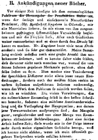 Di recente annunciavo al pubblico entomologico, l’uscita del lavoro “Die Preußischen Käfer”, per il quale il diligente e ragionevole ricercatore naturalistico Prussiano, sig. Farmacista Kugelann di Olterode, mi fornì tutti i materiali, comprensivi di un indice sistematico elaborato da lui. Mi lasciò la libertà di modificare e completare il suo lavoro secondo ai miei ragionamenti, per poi rendere pubblico il alvoro attraverso la stampa.