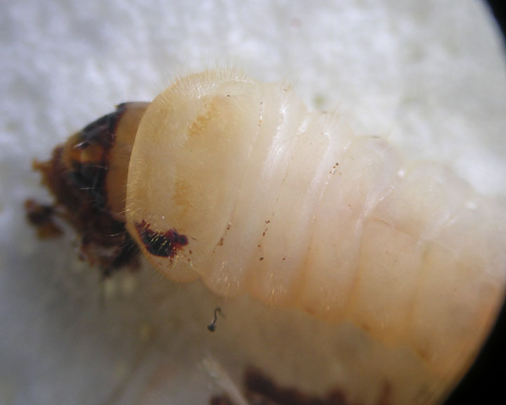 Perdonatemi per le foto bruttissime :oops: ... con questa larva in movimento non sono riuscito a fare di meglio (infatti non so come faccia Giacomo a fare quelle belle foto a fuoco :roll: ). Sembrerebbe un Lamiino, non possiede zampe visibili, ma da quello che visto neppure gli urogonfi (ma potrebbero essere nascosti dietro la piega del penultimo urite). Inutile dirvi che la fretta mi ha giocato un brutto scherzo, e che ho gia rinserito le larve in appositi fori (rigorosamente sotto corteccia) fatti con il trapano :( . Potrebbe essere Acanthocinus sp.? (sicuramente non sono di Rhagium)