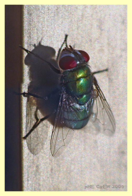 Una prima specie che mi capita di incontrare è questa di cui allego foto di un esemplare dal Monte Limbara, 16.06.07. Ho cominciato da quella che incontro più raramente; nonostante la checklist della fauna d’Italia non dia come presente in Sardegna Chrysomya albiceps, mi sembra che invece sia proprio lei (mi pare di vedere che le setole toraciche sono tutte sottili e corte, il che esluderebbe Lucilla). Del resto sempre la checklist non da neanche una specie di Lucilla per la Sardegna, ma tutte le (comunissime) mosche verdi, qualcosa saranno :sick: .