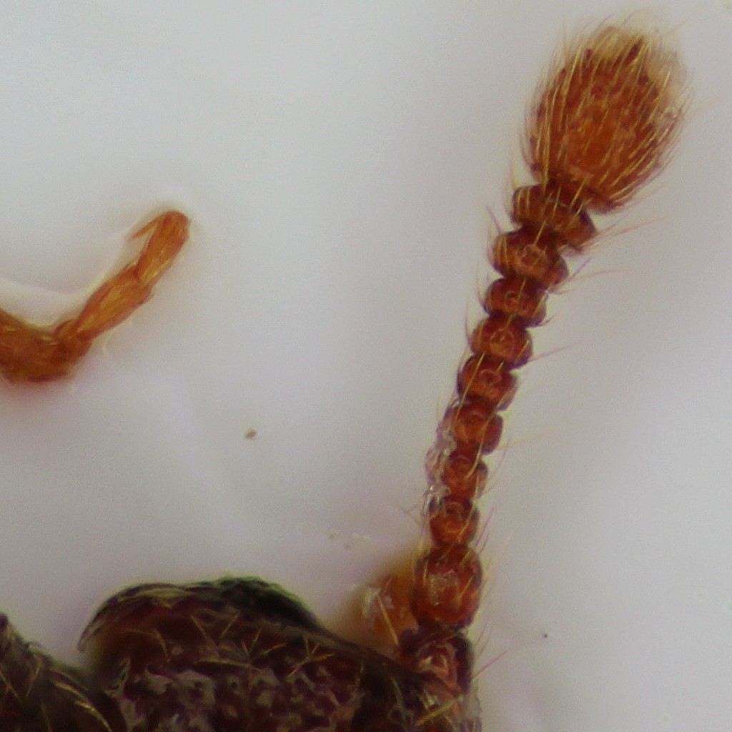 Flash anulare montato intorno a un tubo di prolunga (tra il soffietto e l'obiettivo) schermato con un disco bianco (di carta) tra obiettivo e adattatore RMS - vite 42x1. Per entrambe le foto. Credo che il problema fosse la distanza sensore - obiettivo (oltre al fatto che ho fatto gli scatti in fretta e qualche piano è saltato). La foto seguente l'ho fatta sempre col Nikon E Plan di Andreah, ma stavolta ho misurato la distanza sensore-obiettivo, sui 160 mm, e già mi pare vada meglio. Ho fatto ancora poche foto, quindi lo stacking non è perfetto. Fotogramma completo rimpicciolito: Particolare di una antenna (insieme ai tarsi sono le parti che in foto vengono peggio). Tutte queste foto sono state solo rimpicciolite, o ritagliate, ma non ritoccate. Quest'ultimo è uno Pselaphino di 1,5 mm scarsi, che ora metterò anche a determinare.