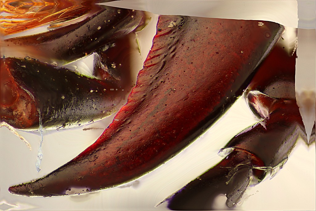 Secondo caso: particolari su più piani, sovrapposti e su fondo bianco.Questa è probabilmente la situazione più difficile da risolvere per i programmi di stacking, anche perchè l'immagine richiede una notevole profondità in proporzione alle dimensioni. Ho scelto di fotografare la mandibola sinistra e i relativi palpi, sempre dello stesso esemplare di Carabus auronitens. Sempre ingrandimento 10 X, stesso tipo di illuminazione, 220 scatti. Inserisco solo le immagini complete, così come uscite dallo stacking, solamente ridotte a 1024x683 Cominciamo con Combine. Qui si notano grossi artefatti ai lati del fotogramma, prodotti dal processo di stacking che ha cercato di uniformare la scala delle diverse immagini e compensare le differenze di prospettiva tra i vari scatti, con perfino parti che il programma lascia in grigio. Le zone di sovrapposizione di più parti si presentano sfocate e sbiadite. Sono presenti zone a chiazze chiare, quasi bianche, non presenti sui singoli scatti. Le parti che non soffrono dei suddetti problemi sono molto nitide e sature. Questo è il risultato degli stessi scatti con Zerene Le deformazioni ai bordi sono presenti ugualmente, anche se di struttura diversa. Le parti sovrapposte, invece di essere sbiadite, si vedono entrambe, ma una sull'altra, come se fossero trasparenti Le parti esenti da questi problemi risultano meno nitide e con colori meno saturi che con Combine. Ho provato anche a combinare più stacking. Ho preso il risultato dello stacking completo con Zerene (quello della foto precedente), poi ho fatto lo stacking della sessantina di scatti che riguardavano la sola mandibola e li ho combinati tra loro facendo lo stacking con Combine ZP, ottenendo questo risultato Suggerimenti su come gestire immagini "difficili" come questa?