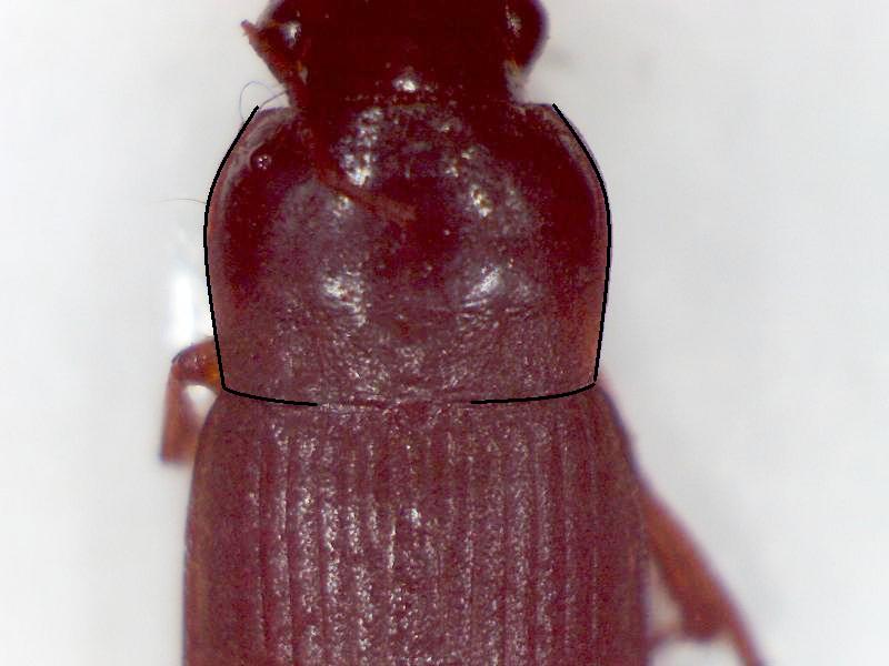 Mi sembra che gli angoli posteriori del pronoto siano ad angolo retto; per sicurezza inserisco due foto, ahimè, fatte di corsa (nella seconda, ho evidenziato la curvatura del pronoto). :hi: