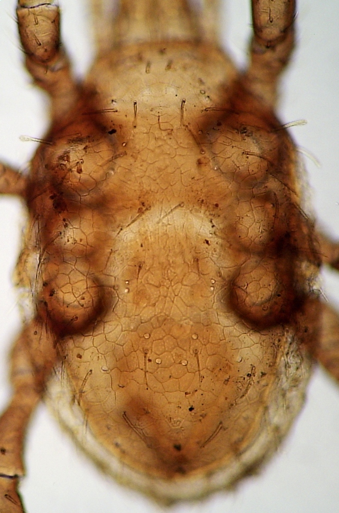 Ecco alcune immagini a titolo di esempio che potrebbero essere più utili (ma non è detto) per la determinazione degli acari. Ho scelto una specie che era già stata proposta da Nicola qui, così è più facile fare un paragone. Gli esemplari sono stati parzialmente chiarificati in acido lattico puro (a freddo) e montati poi in preparati microscopici. Le immagini sono state realizzate al microscopio biologico (bidimensionale) con luce trasmessa. Le dimensioni si aggirano intorno ai 1200 um per gli esemplari in toto, escluse le zampe. questa è la femmina in visione ventrale. Seppure a basso ingrandimento (circa 80X) si può apprezzare la microscultura dello scudo sternale che ha valore diagnostico. questo è il chelicero della femmina (400X). Come si può vedere molti Mesostigmati, oltre ad essere saprofagi, sono anche predatori. Questa è un' immagine dello scudo dorsale della femmina dove si può osservare oltre alla microscultura anche la chetotassi (forma, numero e posizione delle setole) che ha valore diagnostico. Questo è il maschio in visione ventrale. Notare la presenza delle apofisi sul secondo paio di zampe. Questo è il chelicero maschile (400X). Notare la presenza dello spermadactilo sul dito mobile, una struttura che serve ad inserire lo sperma in uno speciale poro della femmina (distinto dall'apertura genitale). Anche la forma di questa struttura ha valore diagnostico. Le mie sono foto realizzate al volo semplicemente avvicinando una compatta ormai superata all'oculare del microscopio, senza nessuna elaborazione successiva e senza soprattutto stacking. Immaginate quindi cosa potrebbero combinare alcuni di voi con questi soggetti.