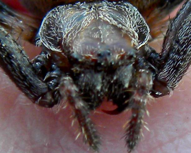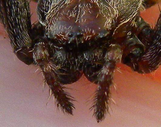Nei ragni della famiglia Araneidae il maschio adulto ha i pedipalpi ingrossati, mentre la femmina no; quest'ultima nella parte ventrale dell'addome ha una struttura annessa ai genitali che si chiama epigino ben visibile e fornita di un processo mediano chiamato "scapo": quella struttura a forma di cucchiaino/linguetta che si vede nell'ingrandimento è lo scapo.
