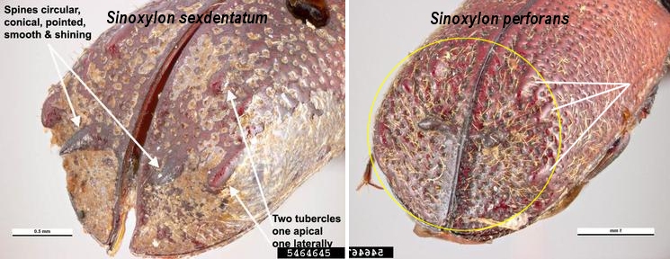 Ti indico due schede delle specie in oggetto (sono dichiarati come esemplari provenienti da museo, quindi spero che siano determinazioni attendibili): Sinoxylon sexdentatum e Sinoxylon perforans