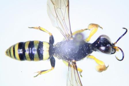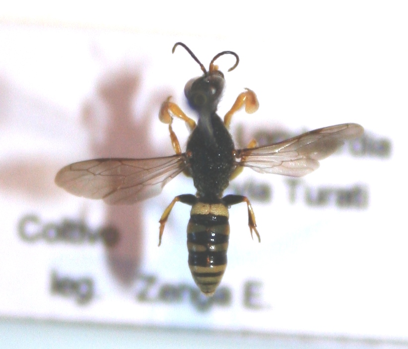 Ciao, di questo imenottero non riesco a determinare ocn certezza nemmeno la famiglia, con le chiavi arrivo a Crabronidae o giù di lì. è lungo circa 9 mm, femmina. Ha i tarsi anteriori molto dilatati a cucchiaio, immagino per scavare il nido.
