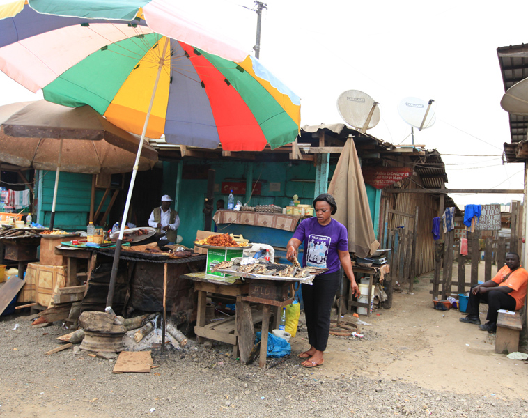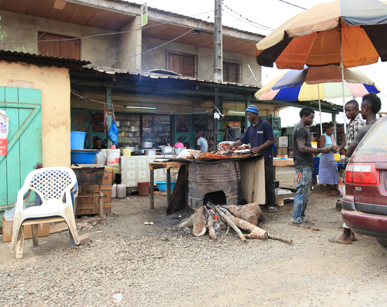 Verso le 13:30 arriviamo in un villaggio maggiore, dove ci fermiamo. Antonio e Pietro ci dicono che mangeremo presso un ristorante tipico del posto. Osservo gli sguardi degli altri, e ho la netta impressione che nessuno ne sia molto felice. Non perché manchi la fame ma probabilmente perché le bancarelle disposte lungo la strada con il cibo cotto e crudo o affumicato in bella vista sotto il sole cocente e esposto a ogni e di più, non è proprio come siamo abituati nel nostro mondo sterile e civilizzato dove la commessa si mette il guantino in lattice per prelevare il panino confezionato dal banco frigo e lo serve con posate monouso rigorosamente confezionate. No, qui è leggermente diverso. la cacciagione, frutto di una notte di lavoro è stata venduta dal cacciatore in mattinata direttamente al ristoratore. Questo la taglia in porzioni e la espone in bella vista in cima ad un grande fusto di petrolio vuoto, e un pezzo di cartone ondulato, recuperato da qualche scatolone gli fa da piatto. In men che si dica la carne è ricoperta da una fitta coltre di mosche verdi e nere, ma questo non infastidisce. Nessuno vuole fare il pignolo, e in attesa che si cuocia la carne brindiamo con una fresca birra d’importazione. Sembra assurdo, ma gli unici frigoriferi che si vedono sono quelli pubblicitari stipati di birra e coca cola. Tutto il resto viene conservato all’aria aperta.