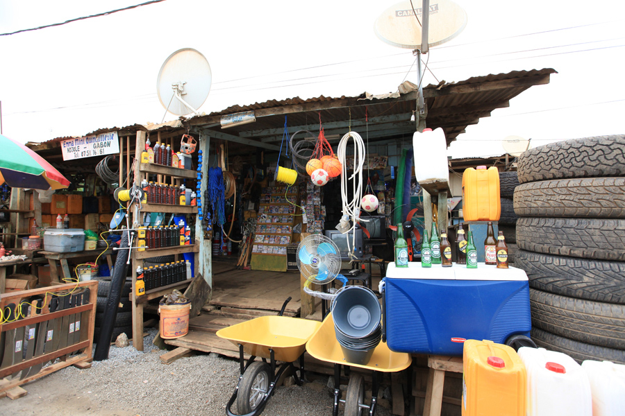 Giusto per passare il tempo osservo la nostra corsa con il GPS e confronto velocità con strada da fare e calcola che calcola, non possiamo arrivare a Makokou prima delle 21:00. Non che vi fossero problemi, ma all nostro arrivo a Ipassa non è organizzata nessuna cena quindi avremmo dovuto fare la spesa in uno dei Ck2, soltanto che alle nove di sera, probabilmente avremmo trovato tutto chiuso. Per chi non fosse pratico, “secado” è una famosa catena francese di supermercati, e si trova anche in Gabon. Quindi si decide di fermarsi nel primo villaggio e di fare provviste. Le macchine rallentano in vista ad un gruppetto di case, e ci accorgiamo che si sta già facendo buio. Chiediamo e ci facciamo indicare il negozio. Sui pochi scaffali in legno sono disposte diverse scatole di latta con tonno, sgombro, paté di fegato e pollo. Qualche confezione di biscotti, alcune bibite, pan carré, carta igienica, sapone e polvere contro i pidocchi. Hanno poco ma l’essenziale. Ognuno di noi fa le sue provviste e torniamo in macchina. All’uscita del villaggio, l’ennesimo posto di blocco, controllo dei documenti, le medesime domande, e identiche risposte. Ormai è diventata routine, perché lungo tutto il percorso ad ogni passaggio di provincia abbiamo trovato questi controlli.