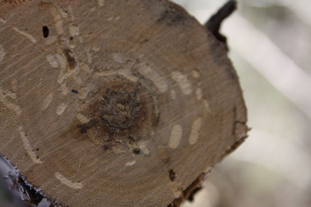 Segando i tronchi, la sezione rivela una selva di gallerie inconfondibili, che indicano una massiccia infestazione da parte di clytiini.