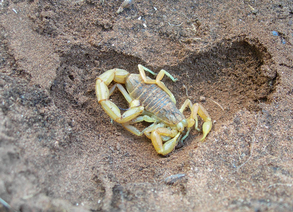 Per una mia sbadataggine uno scorpione come questo stava per pungermi: per fortuna non è riuscito a bucarmi il palmo della mano.