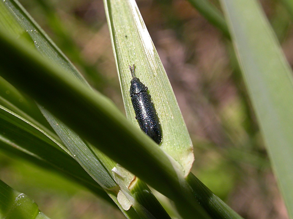 Stamattina, approfittando del fatto che giovedì finisco presto di fare lezione, sono andato un'oretta in un posto che avevo sempre trascurato, a pochi km da casa, entro il G.R.A., a vedere se per caso vi era un particolare Buprestidae. Dopo aver trovato quel che cercavo, mentre tornavo verso la macchina attraversando un prato sulla collina ... mi sono accorto di alcune macchioline nere sulle graminacee, e dando un'occhiata più da vicino .... Ogni tre o quattro steli, c'era una Leptispa filiformis (Germar, 1842), o anche due! Ho dato una controllata intorno e ne ho viste diverse, tutte su questa graminacea, nascoste tra la base fogliare e lo stelo, intente a mangiare la foglia o ad accoppiarsi. Allora ho pensato che, anche se era tardi, valeva la pena di passarci un po' di tempo, e in una ventina di minuti, senza neanche montare il retino, ecco il risultato! Chi diceva che questa bestia è rara e sporadica e si trova nei prati umidi? Vi faccio anche notare che nel raccoglierle ho commesso un errore, ed ho preso un Eterottero che stava nella stessa posizione e che somiglia "un pochino" alle Leptispa. Qui si vede meglio.