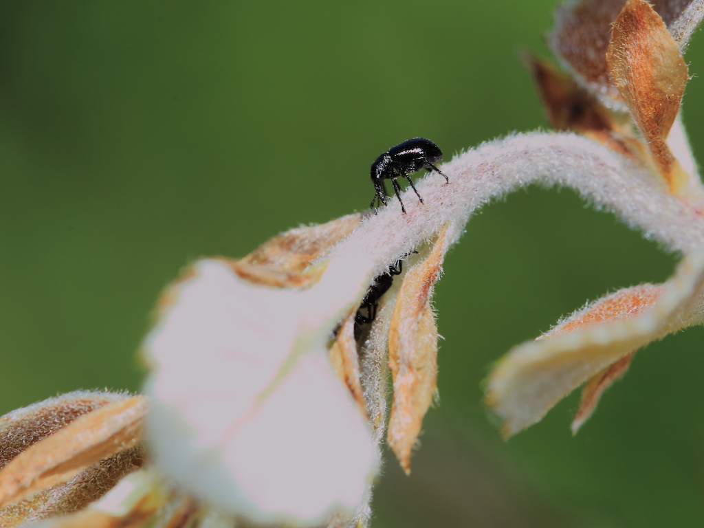 Un crisomelide su quercia E ora veniamo ai Rhynchitidae. Come detto da Leonardo, eravamo partiti compilando un elenco delle specie che non erano segnalate dall'Elba, ma ragionevolmente avremmo potuto trovare. Purtroppo su questo non abbiamo avuto fortuna, ma io sono convinto che alcune almeno sicuramente salteranno fuori (per esempio Rhynchites giganteus). Anche con l'aiuto di Giuliano, un esperto naturalista locale, Leonardo mi ha organizzato un divertente "pero tour": tra loro due riuscivano a ricostruire le località sull'Elba dove si trova qualche esemplare di pero selvatico (anche uno solo isolato  ). Si partiva e si andava a trovarlo, poi ... giù bastonate, ma sui teli purtroppo nessun Rhynchites. In compenso abbiamo falciato alcuni esemplari (e Leonardo ne ha raccolto un altro a vista sul rovo) di Neocoenorrhinus germanicus. Ma la specie più interessante che abbiamo osservato è stata certamente quella che produce questi danni su leccio e sughera: Auletobius politus.