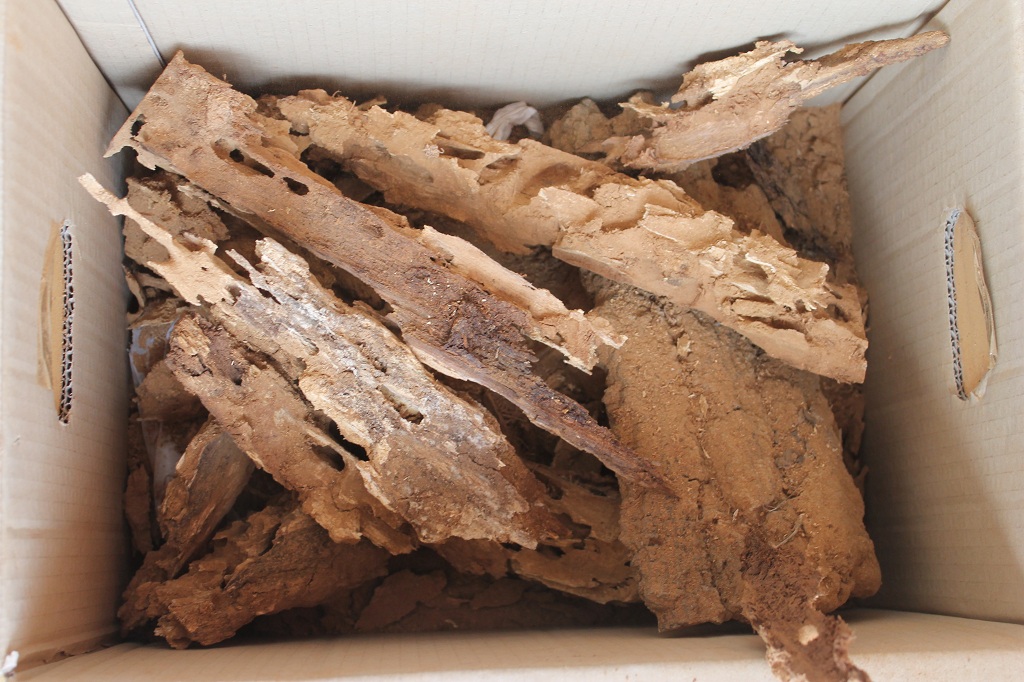 A causa del forte vento, mi sono accorto purtroppo che la scatolone con il legno prelevato in questa occasione è caduto dal tavolo sul quale l'avevo posizionato ed il legno all'interno è andato in frantumi, le larve si erano date parecchio da fare ed erano più del previsto, dai detriti ne ho tirate fuori una cinquantina