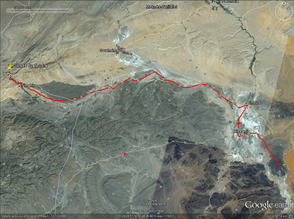 Nono giorno (05/06/2012)Tracciato nono giorno Il mattino, a colazione, conosco due ragazzi di Genova che sono stati in quell’hotel una settimana per fare arrampicate sulle rocce delle gole, e sono in partenza anche loro (ma per tornare in Italia). Dopo colazione carico i bagagli in macchina ed il titolare dell’hotel, sapendo che sarei andato a fare un giro alle Gole del Dadés dopo di che sarei tornato indietro per passare da Er- Rachidia e proseguire verso nord, mi ha invitato a pranzare (gratis) da loro, se al ritorno mi fossi fermato nuovamente lì; ringraziando ho ovviamente declinato l’invito perché la cosa avrebbe voluto dire perdere almeno almeno 3 o 4 ore, e la strada da fare era tanta. Mi ha quindi chiesto se potevo accompagnare un suo amico fino a Tineghir e, ovviamente, ho accettato (ero di strada). Durante i 12-13 km tra le gole e Tineghir questo signore (purtroppo non ricordo un solo nome di tutti quelli che ho conosciuto perché mi risultano complicati, sia da pronunciare che da ricordare) mi illustra un po’ la zona, le coltivazioni, qualche cenno di storia, ecc. Insomma, è un piacere ascoltarlo. A Tineghir ci salutiamo e io proseguo verso ovest fino alle Gole. Ad un certo punto, lungo la strada, in mezzo al nulla, c’è una specie di “porta” ai lati della strada che sinceramente io non ho capito a cosa possa servire. Dal momento in cui si lascia la strada N10 e si prende quella per le gole (distanti una trentina di km.) si trovano bei paesaggi ma le gole in sé per sé mi hanno un po’ deluso: strada e piccolo torrentello costeggiati da due pareti a picco di roccia, molto vicine tra loro, lunghe un centinaio di metri (forse qualcosa di più). Boumaine ed Dadés Fiume Dadès Paese lungo la valle del Dadés Valle del Dadés Passate le gole mi fermo in un punto in cui noto alcune piante e provo a dare un’occhiata in giro; trovo un po’ di scarabeidi (comprese due Hoplia molto chiare, quasi bianche) e un po’ di curculionidi. Mentre cercavo mi si avvicina un signore con il figlio (era un po’ che mi guardavano da una tenda lì vicino) e mi chiede incuriosito cosa stessi facendo; gli dico che sto cercando insetti facendo loro vedere quelli che avevo trovato, e a quel punto mi chiede il perché; gli rispondo che li studio e li colleziono (avrà capito?). Fatto sta che poi si allontana e mi dice di stare attento alle spine delle piante sulle quali sto cercando. Riparto e torno indietro sulla N10 per raggiungere Er-Rachidia. Nel tratto tra le due gole (Dadés e Toudra) trovo alcune mandrie (si dirà così?) di dromedari; poco dopo ne trovo uno che “pascola” sul bordo strada. Continuo fino a Er-Rachidia dove prendo la N13 verso Nord, fermandomi in serata poco prima di Midelt perché, per mio puro sfizio, volevo fermarmi a dormire nell’Hotel Kasbah Assmaa; l’avevo visto sulla guida e ci ero passato davanti nel tragitto di andata. Ha una facciata stile Kasbah e immaginavo che dentro fosse molto bello. Ed infatti così è. Faccio una doccia e scendo a cena, poi mi metto a cercare insetti fuori dall’hotel, con la lampadina. Il guardiano del parcheggio dell’hotel, ovviamente incuriosito, mi chiede cosa stessi facendo così glielo spiego e prima mi suggerisce di provare a guardare lungo il muro di cinta dell’hotel (e trovo qualche tenebrionide), poi mi accende tutte le luci del giardino interno all’hotel e mi manda a cercare sulle piante del giardino .. ma qui non trovo assolutamente nulla. Mentre ero all’esterno mi si avvicina il proprietario dell’hotel, anche lui incuriosito da quello che facevo, e gli faccio vedere i pochi insetti che avevo trovato. Mentre chiacchieravamo ci passa vicino un grosso riccio (porcospino) al che mi dice che da loro non sono molto frequenti e vengono mangiati (e considerati una leccornia). ..... segue .....