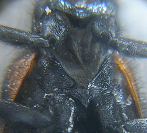 Intanto c'è da dire che bisognerebbe osservare il carattere a maggiore ingrandimento e poi forse schermando un po' di più la luce. Forse tu ti sei basato solo sul fatto che non sembra avere apparentemente una pubescenza però secondo me lo scutum è punteggiato. Ti allego una foto ritoccata che è venuta una mezza ciofeca che indica in giallo dove si trova lo scutum del mesosterno.