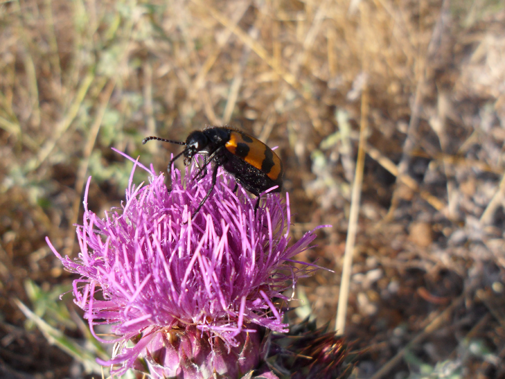 Questa mattina sono tornato a prendere le trappole, ancora non ho controllato bene ma ci sono molte blattine, un paio di falene, tante formiche e in una anche tre lucertole(che userò per le trappole per necrofori) Inizialmente deluso per le trappole sono diventato particolarmente felice quando ho visto delle piante di cardo  Speravo di trovare qualche Agapanthia, ma ho trovato ben altro. Ho raccolto infatti 4 Netocia morio, una Protaetia cuprea, un'Argiope, un Purpuricenus e 3 Mylabris. Queste ultime erano in quantità sorprendenti, ve ne saranno state alcune migliaia che volavano, si nutrivano su tutti i fiori presenti e mi si posavano addosso, però ne ho raccolte poche perchè non mi interessano e perchè erano quasi tutte femmine gravide. Purtroppo non avevo la macchina fotografica e non ho potuto fotografare la scena