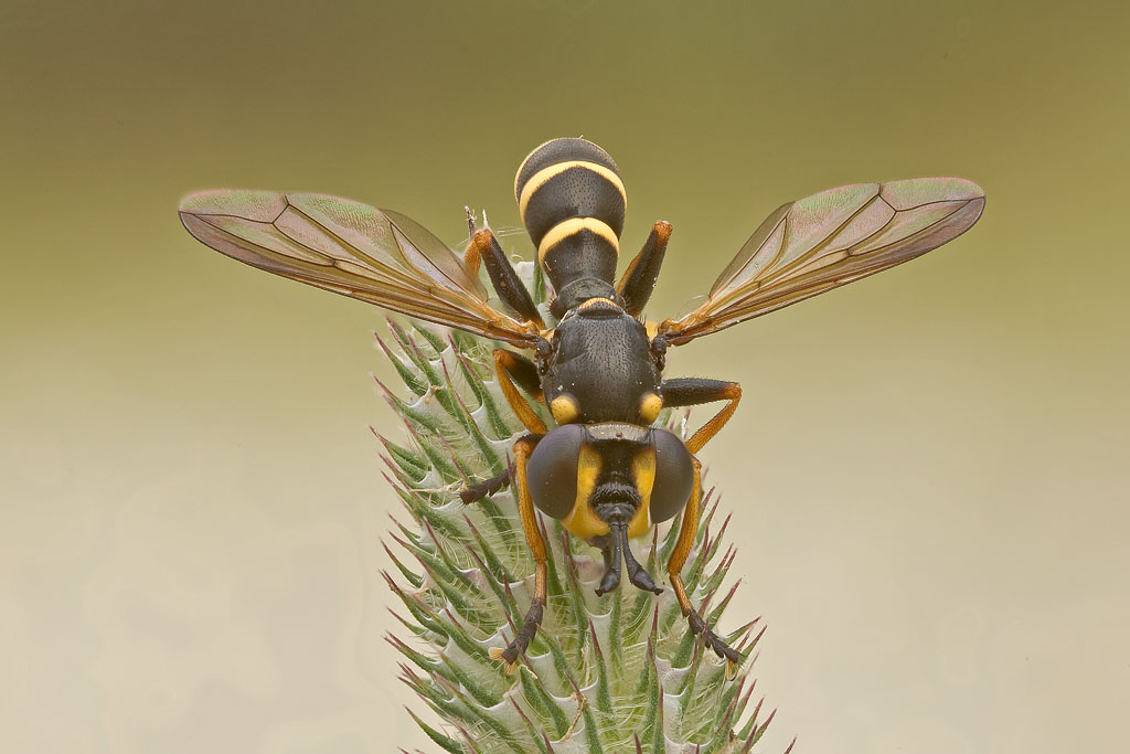 Confermo C. flavipes, questo è ovviamente un maschio... le femmine della maggior parte dei conopidi hanno i segmenti terminali dell'addome più o meno modificati in relazione all'ovideposizione... in particolare il il 5° sternite si prolunga spesso in basso in un'appendice variamente sviluppata, chiamata impropriamente "theca", che è utilizzata per aderire all'ospite durante la (solitamente traumatica) deposizione dell'uovo... nella femmina di C. flavipes la "theca" è nera, appuntita ed molto sviluppata... guarda se ne trovi una da fotografare (è una specie comune anche qui al Centro, in collina e montagna)!