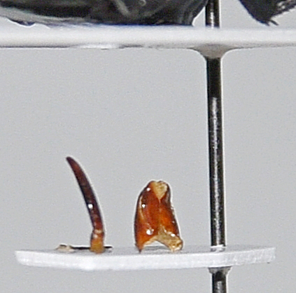 È preferibile che i pezzi siano incollati "in verticale" per consentire una visione da ogni parte, mentre lo spiculum (nella prima foto si intravvede dietro all'edeago), è incollato coricato.