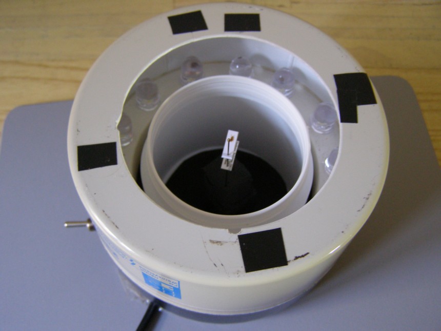 Ecco come funziona il mio “alambicco”: Per adesso ho adattato il tutto ad una Compatta Digitale, e precisamente la Nikon P5100, successivamente prevedo di modificarlo per la Reflex . 1)Ho fatto in modo di poter scattare con un flessibile senza toccare la Digitale (per gli eventuali mossi). Al lavoro nei tempi morti consentiti (pause pranzo e termine turno di lavoro) mi sono costruito un supporto per la compatta. Foto 1. 2)Poi mi sono successivamente costruito due supporti da inserire nella filettatura esterna (dove di solito si usa per i filtri o per una lente aggiuntiva) della Digitale, uno con la parte opposta a filettatura dove vi si possano inserire gli Obiettivi per Microscopio Foto 2 (di solito uso quelli in cui la distanza tra la lente e l'insetto varia dai 5 a 10 mm e come ingrandimenti vario da 2.5X, 5X, 8X,), l'altro Foto 3, con filettatura che porta un Obiettivo manuale Macro rovesciato. 3)Si inseriscono gli obiettivi in questo caso Foto 4, quelli per insetti da 1 a 6mm. 4)E si inserisce il tutto Foto 5-6, in uno Stage porta microscopio che abbia le manopole micrometriche. 5)A questo punto mi sono costruito l'ennesimo marchingegno di cui accennavate (la campana internamente illuminata) la base Foto 7, dove sono collegati i Led e il coperchio Foto 8, verniciati all'interno tutti e due di bianco opaco Foto 9, assemblato. 6)Nella Foto 10, lo vedete illuminato, ma se guardate bene all'interno si forma un alone troppo chiaro che disturba la Digitale e le foto risultano con vari riflessi e macchie. Segue