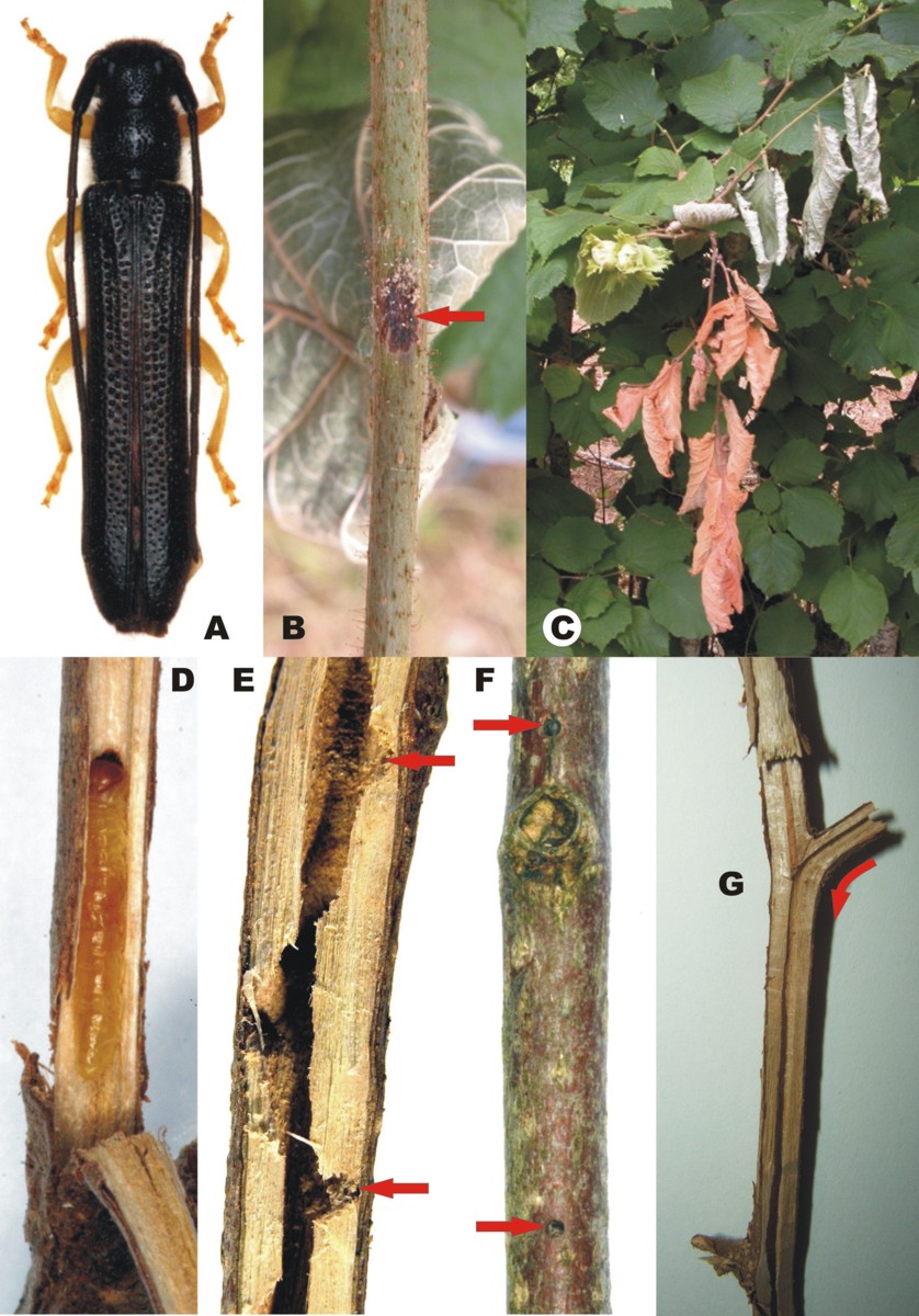 Barbagia di Belvì, Oberea linearis (L.) su nocciolo: A) adulto; B) tacca d’ovideposizione; C) apice disseccato di rametto attaccato dalla larva; D) larva esposta ad arte; E) sezione di rametto attaccato con evidenziate le “finestre” per la fuoriuscita della rosura; F) idem con rametto integro; G) galleria larvale che dal rametto di un anno prosegue in quello di due anni.