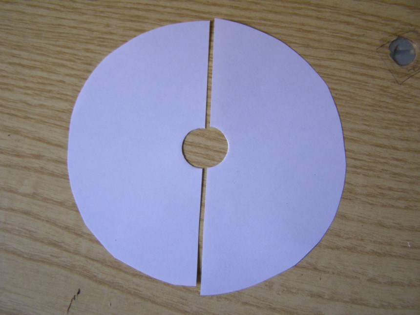 9)Ora si deve costruire con un foglio bianco da stampante, un cartoncino con un foro di 13-14 mm., che poi si taglia a metà Foto 14,