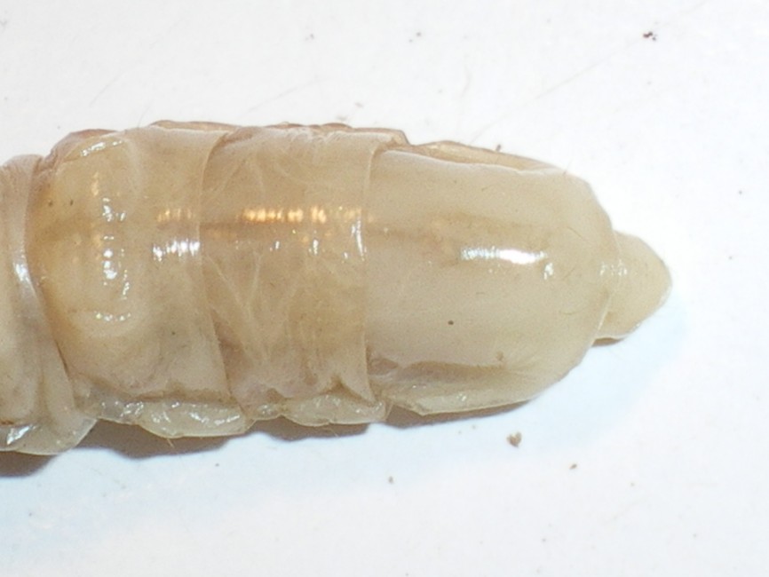 La larva in oggetto delle foto precedenti è morta (da un pezzo) e sott'alcool... Fino alla settimana scorsa dal ceppo cadeva solo tanta rosura e cominciavo a perdere le speranze imputandola a dei Dorcus... Ma a distanza di un anno ecco cadere un'altra larva dalle gallerie terminali. La rinfilo dentro... non vuole saperne e si ributta fuori! Al che mi viene un dubbio: non è che si buttano fuori (l'aveva fatto anche la prededente lo scorso anno) cercando della terra dove approntare una celletta??? Mi pare che i Prionus facciano così... Che ne pensate? Io per non sapere ne leggere ne scrivere ho riempito il contenitore di terra e ci ho piantato il ceppo!  Ciao