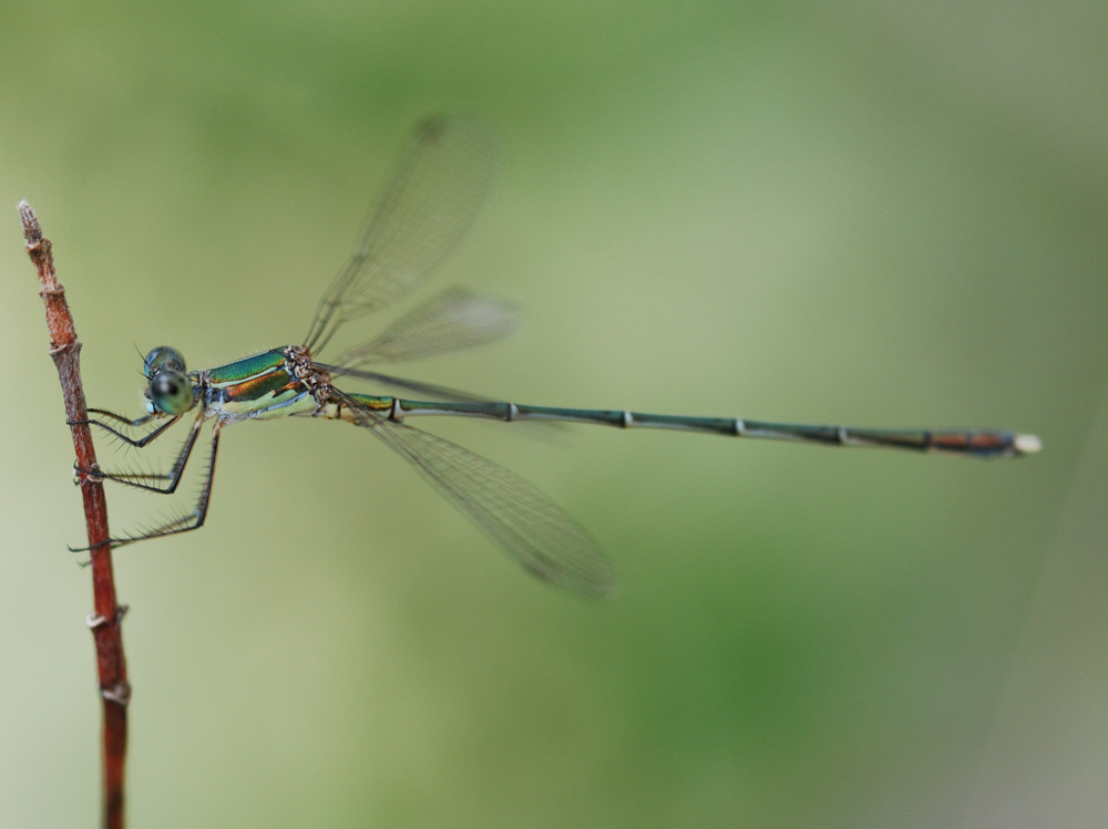 Come tutti gli anni il piccolo stagno che frequento sui Colli Euganei si riempie di queste Lestes, che avevo sempre identificato come Lestes viridis, però il dubbio si insinua sempre più: la macchietta nera in fondo ai cerci mi sembra veramente piccola, e non estesa sul lato.